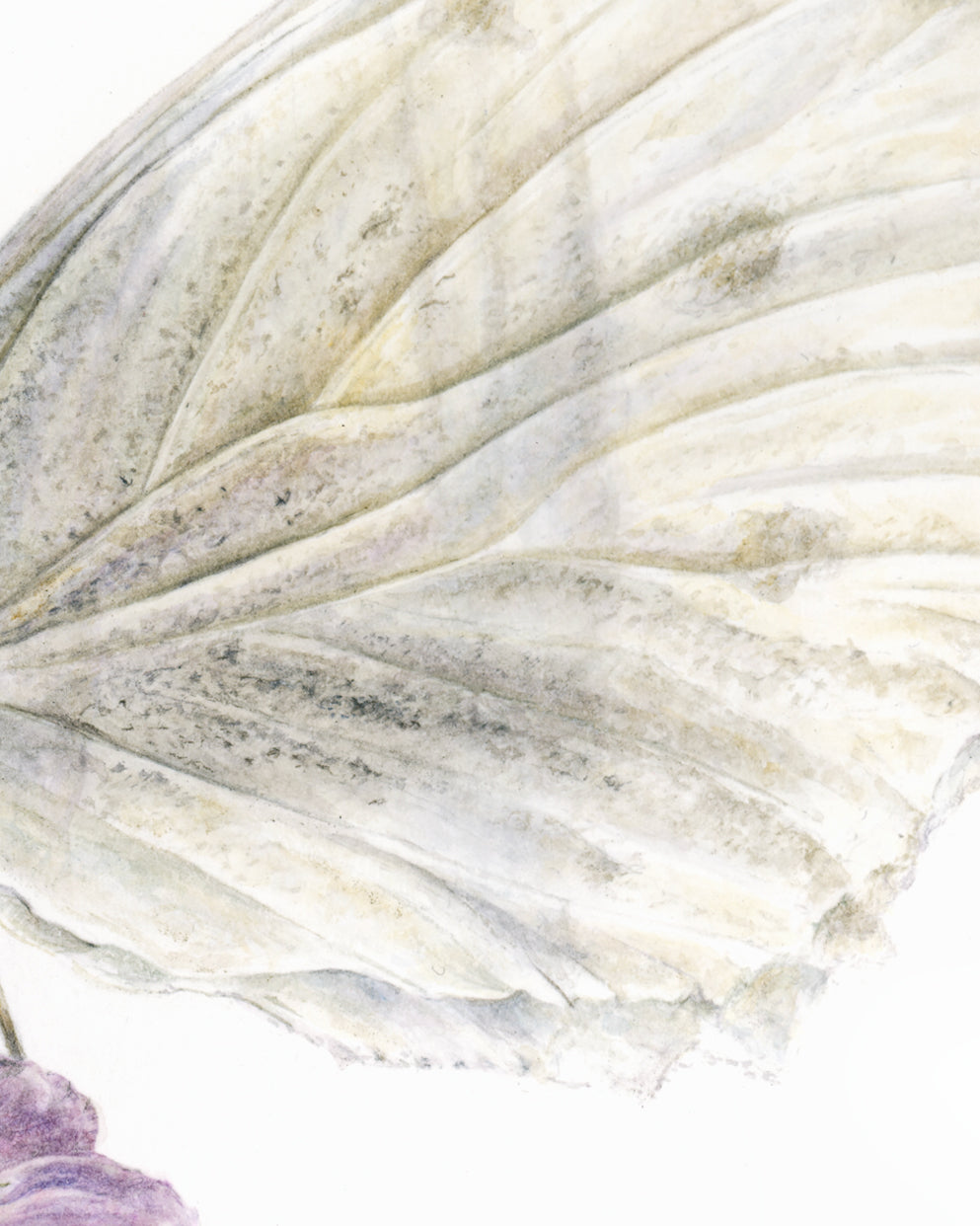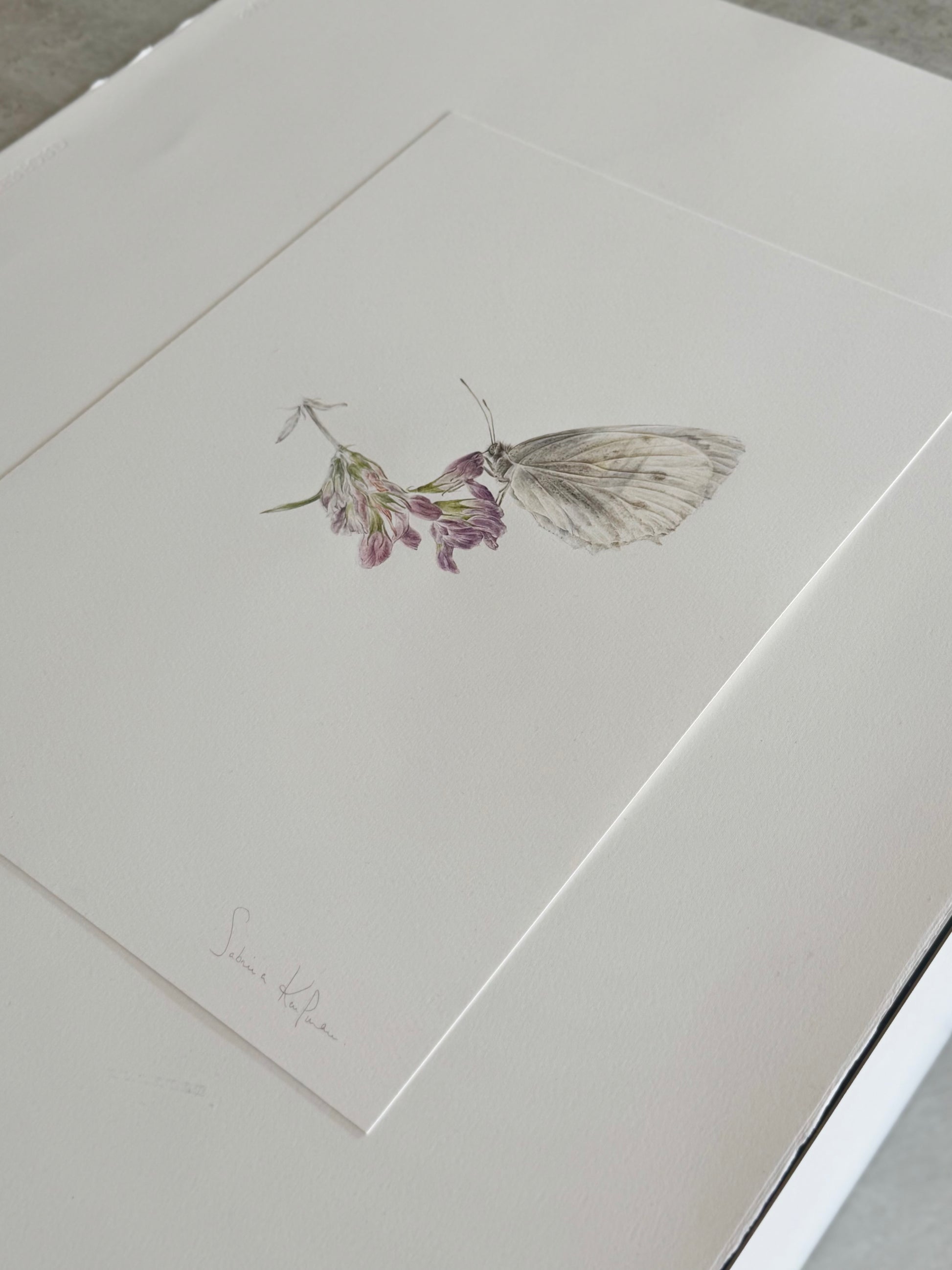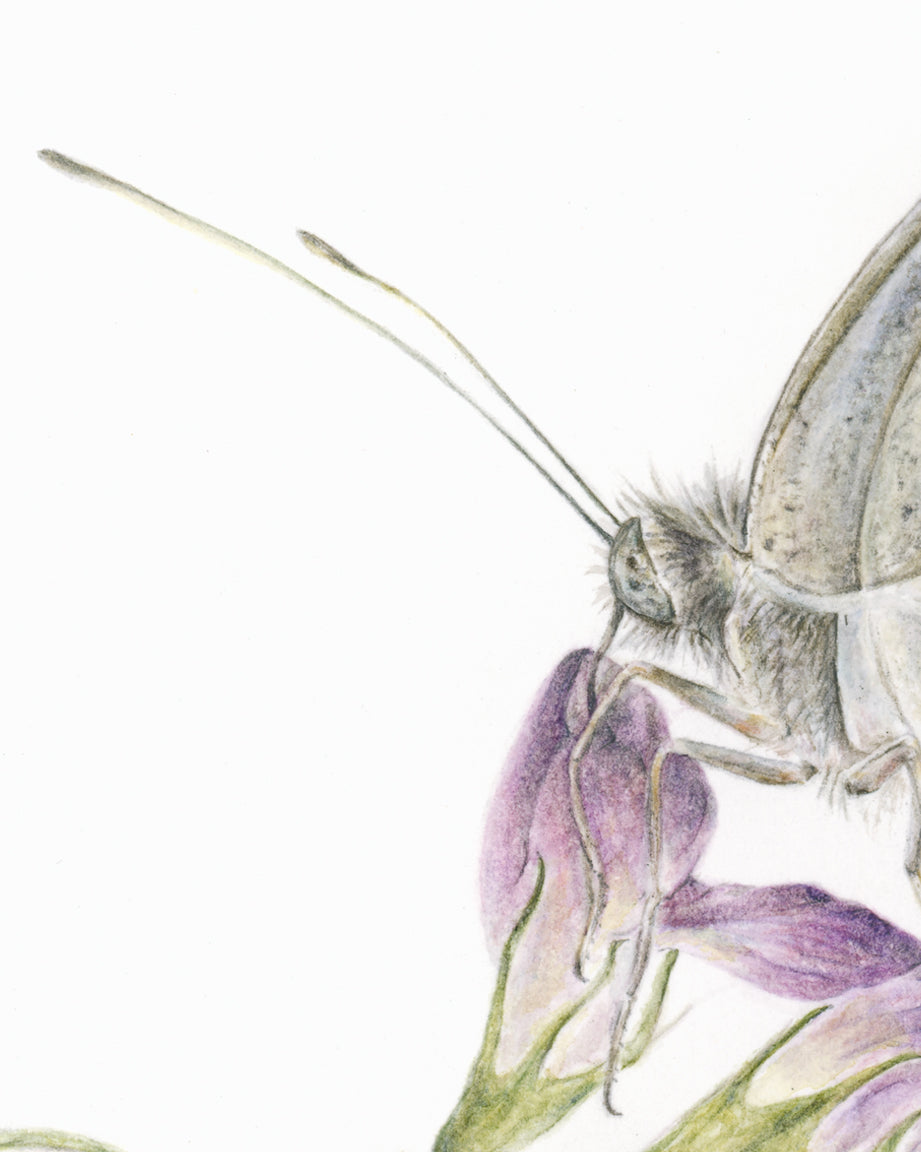 Un papillon piéride posé sur une tige de luzerne, rendu dans ses nuances réelles.